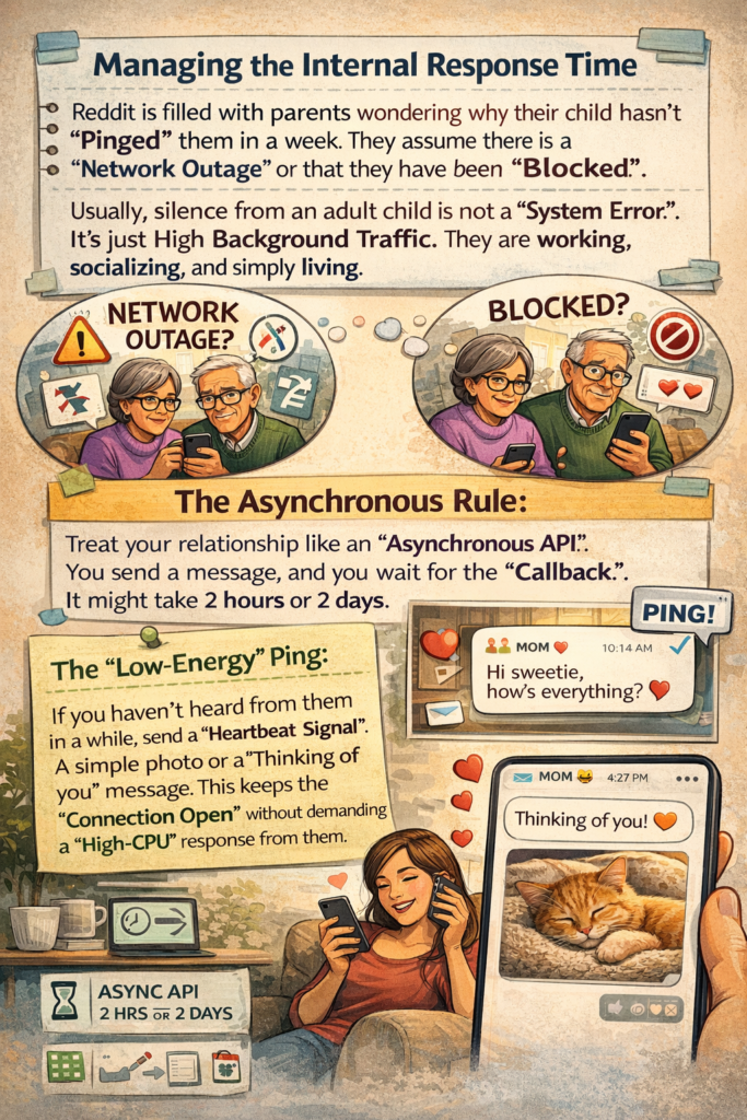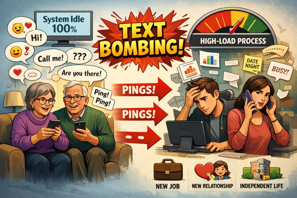 On Reddit, the #1 complaint from adult children is the “Text Bombing” from parents. This is a Bandwidth Issue. You have 100% “System Idle” time and want to fill it with “Pings” to your children. They are running “High-Load Processes” (new jobs, new relationships, independent lives) and cannot handle the frequency of your requests.